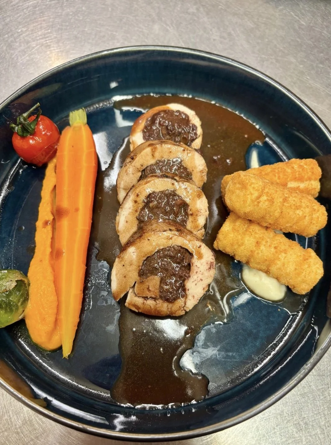 Filet de poulet fermier farci au boudin noir et foie gras, croquettes;