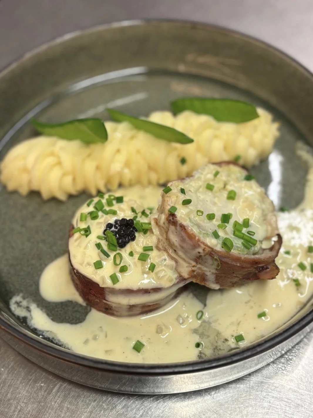 BALLOTTINE de cabillaud au choux et au lard, purée.